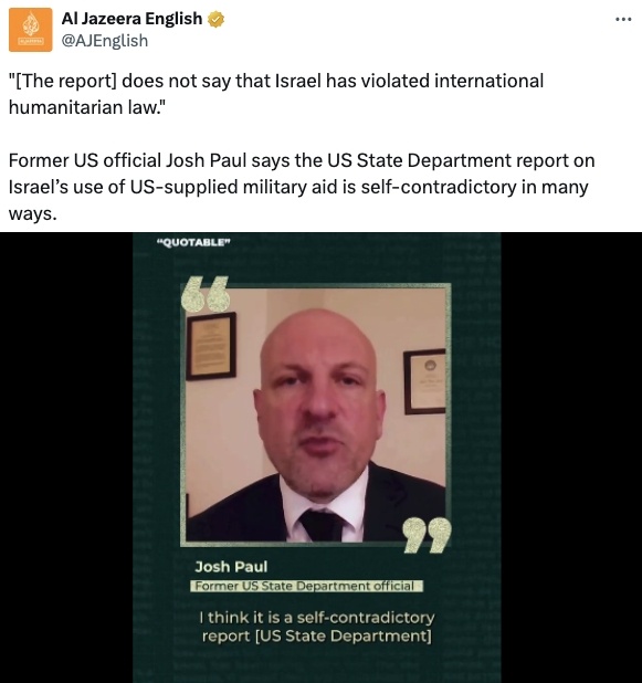 因不滿拜登政府巴以政策而于去年10月辭職的美國國務院政治軍事事務局前主任喬?!けA_認為,這是一份自相矛盾的報告,沒有從所確定的事實中得出合乎邏輯的結論。
