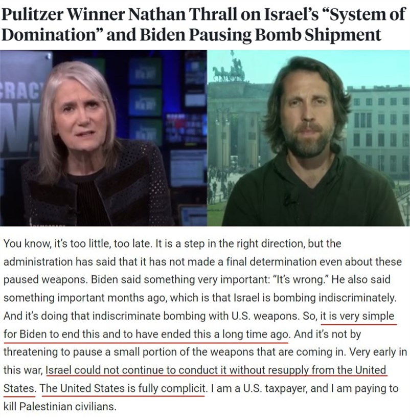 “實際上,在這場沖突的早期,如果沒有美國的軍援,以色列根本無法繼續(xù)其軍事行動。美國完全是同謀?!?/p>