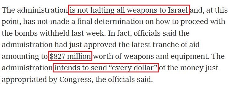 事實上,就在暫停向以色列運送重型炸彈的同時,拜登政府剛剛批準了最新一批價值8.27億美元的對以軍事裝備援助。用美國官員們的話說,拜登政府打算把最新對以援助撥款的“每一美元”都用出去。