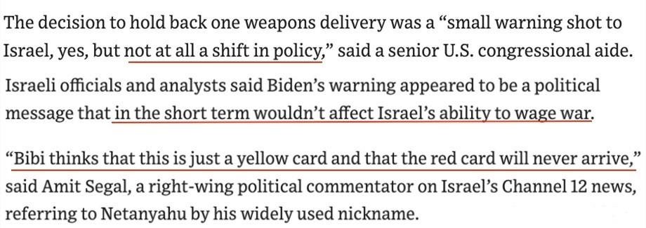“比比(內塔尼亞胡的昵稱)相信拜登只是對他亮出了一張黃牌,而紅牌永遠不會到來?!?/p>