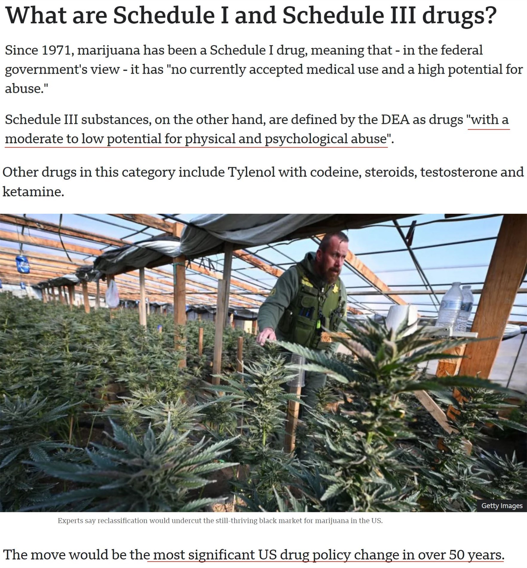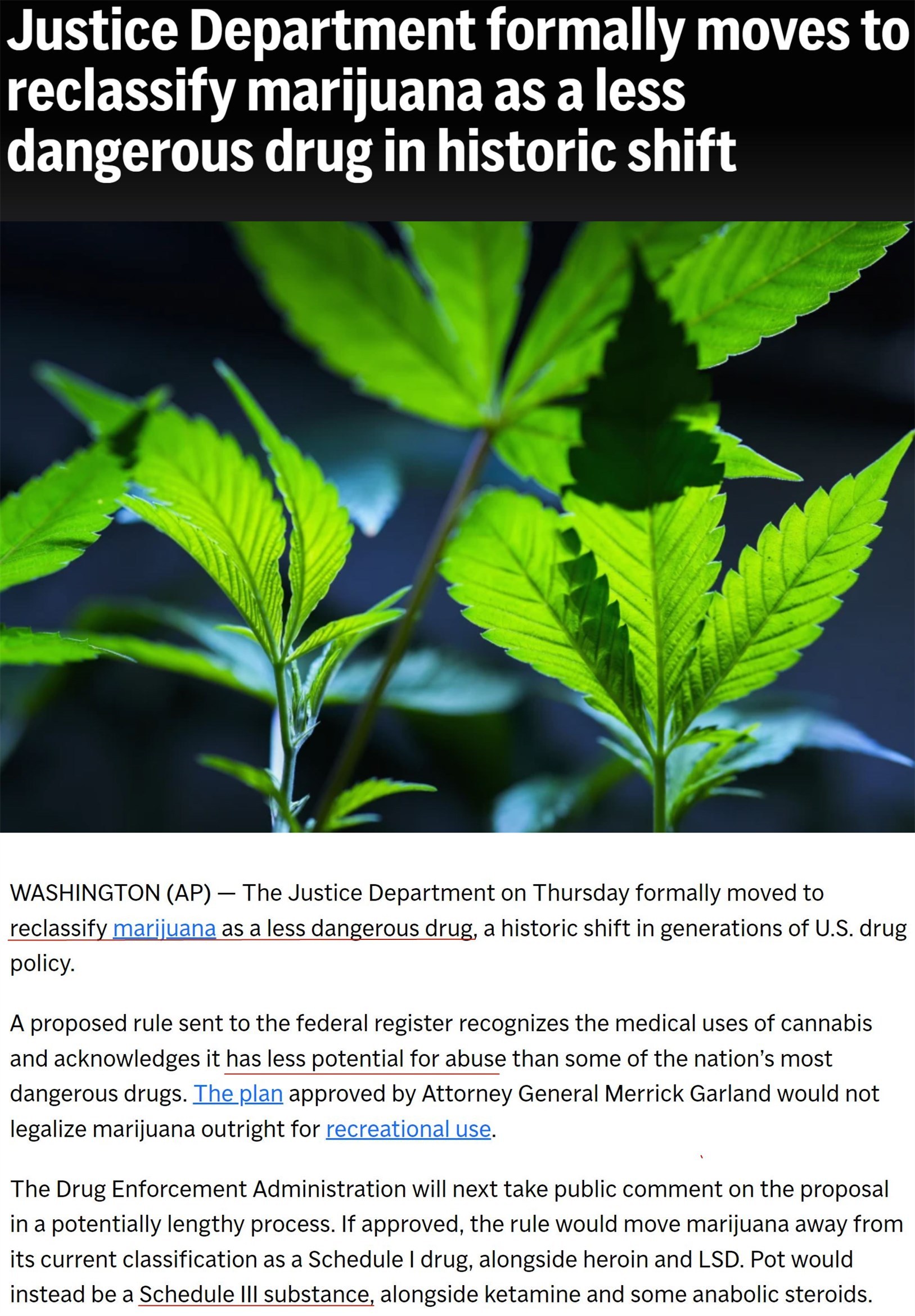 如果經(jīng)過60天的公眾意見征詢期后最終獲批,新規(guī)則雖然不會(huì)在聯(lián)邦層面將大麻完全合法化,但會(huì)將其移出《美國聯(lián)邦管制物質(zhì)法案》中列管海洛因等最危險(xiǎn)毒品的“附表一”,轉(zhuǎn)而歸入列管氯胺酮和類固醇等危險(xiǎn)性較低藥物的“附表三”。