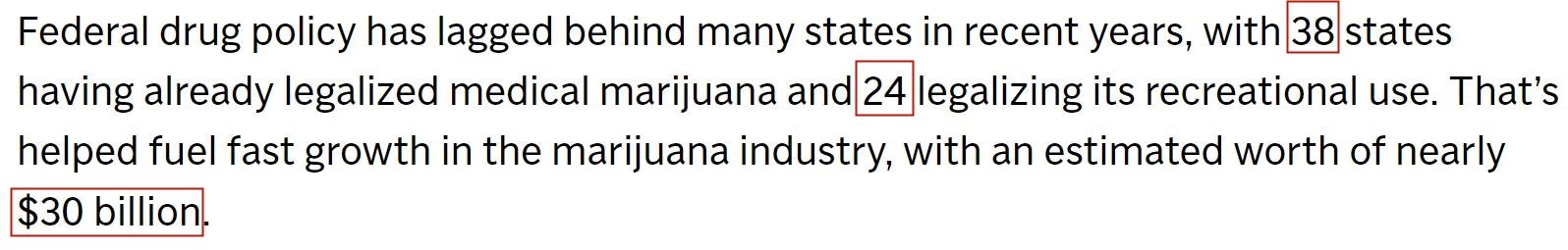 自1971年美國《聯(lián)邦管制物質(zhì)法案》實(shí)施后,大麻一直被列為一級管制藥物,這意味著大麻和海洛因及某些新型致幻毒品一樣,沒有“可被接受的醫(yī)療用途”,且“濫用的可能性很大”。