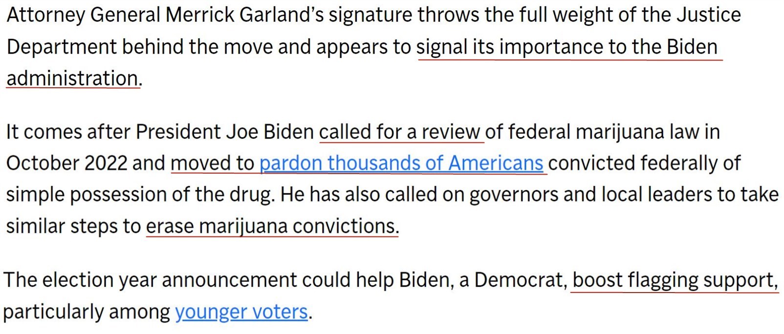 美聯(lián)社分析指出,美司法部對修改大麻分類的全力支持,表明了此舉對拜登政府的重要性。拜登在大選前夕推動(dòng)大麻去罪化,就是為了吸引年輕選民的支持。