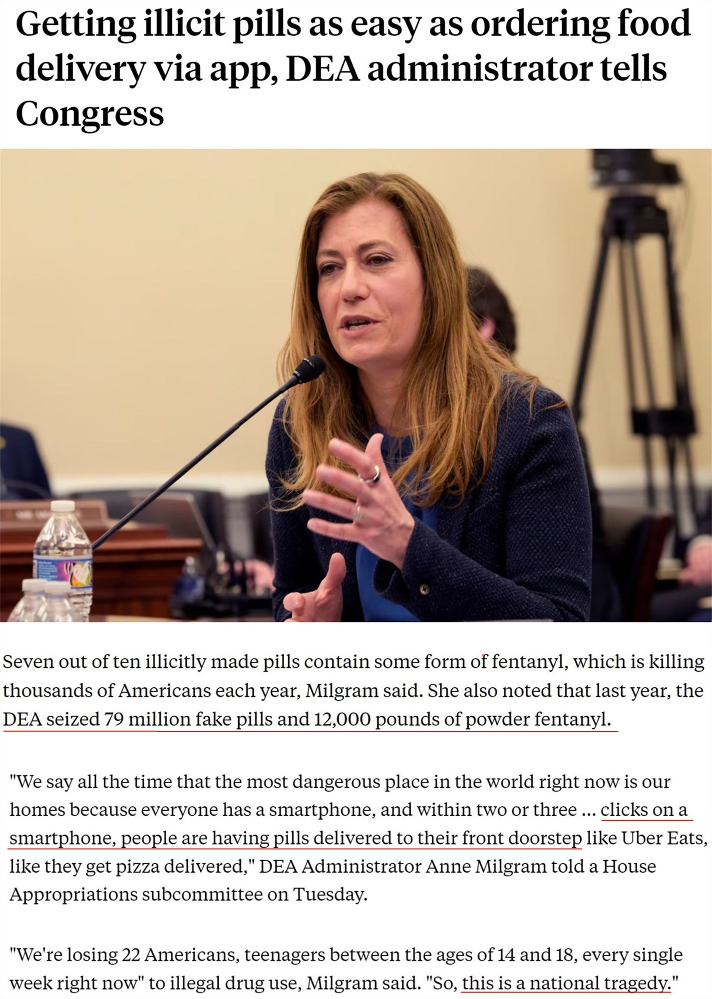 美國禁毒署署長安妮·米爾格拉姆本月早些時(shí)候告訴國會(huì):“現(xiàn)在世界上最危險(xiǎn)的地方就是我們的家,因?yàn)槊總€(gè)人都有智能手機(jī),只要用手指點(diǎn)上兩三下,就能像在外賣平臺點(diǎn)比薩一樣,在家門口收到非法藥丸?!?/p>