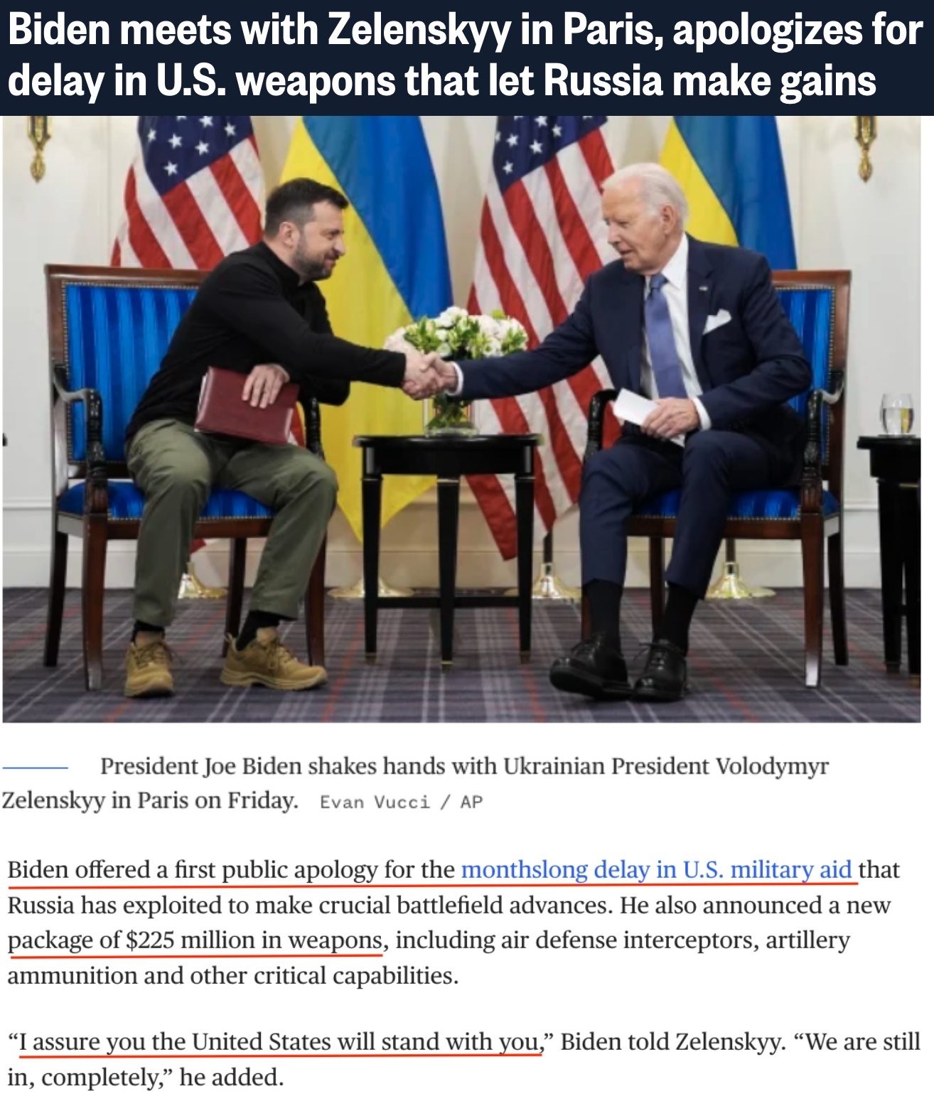 在巴黎會(huì)見烏克蘭總統(tǒng)澤連斯基時(shí),拜登首次就美國國會(huì)未能更早通過對(duì)烏新援助法案“道歉”,并宣布將再向?yàn)蹩颂m提供2.25億美元援助。