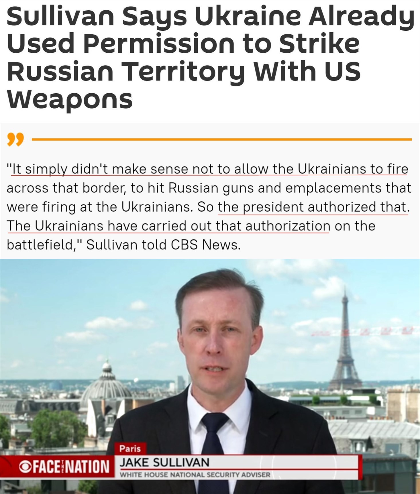 △俄羅斯衛(wèi)星通訊社:美國總統(tǒng)國家安全事務(wù)助理沙利文9日在接受美媒采訪時(shí)證實(shí),烏軍已經(jīng)使用美國提供的武器打擊俄羅斯本土目標(biāo)。