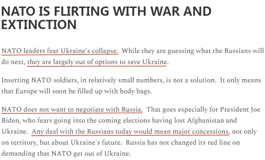 美國記者、前國防部官員斯蒂芬·布萊恩日前發(fā)表題為《北約正把戰(zhàn)爭(zhēng)和滅亡當(dāng)兒戲》的文章指出,雖然北約的領(lǐng)導(dǎo)人們擔(dān)心烏克蘭崩潰,而且他們?cè)诤艽蟪潭壬暇炔涣藶蹩颂m,但卻不想與俄羅斯談判。美國總統(tǒng)拜登尤其如此。