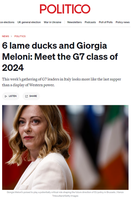 面對(duì)各自國(guó)內(nèi)嚴(yán)峻的政治形勢(shì),本次G7峰會(huì)開得真有些力不從心、心猿意馬。法德兩國(guó)領(lǐng)導(dǎo)人所在政黨在上周剛剛結(jié)束的歐洲議會(huì)選舉中表現(xiàn)堪憂;英國(guó)首相蘇納克更在朝不保夕中擔(dān)憂著自己的保守黨會(huì)在下月初大選中走到窮途末路;美國(guó)總統(tǒng)拜登更是處處遭逢著大選對(duì)手特朗普的咄咄逼人。美國(guó)政客新聞網(wǎng)歐洲版(Politico.eu)捕捉到了這種有趣的心不在焉的會(huì)議氛圍,以《六只跛腳鴨和梅洛尼》為題諷刺總結(jié)本次峰會(huì),“在意大利舉行的七國(guó)集團(tuán)峰會(huì)看起來更像是最后的晚餐,而不是西方力量的展示”。