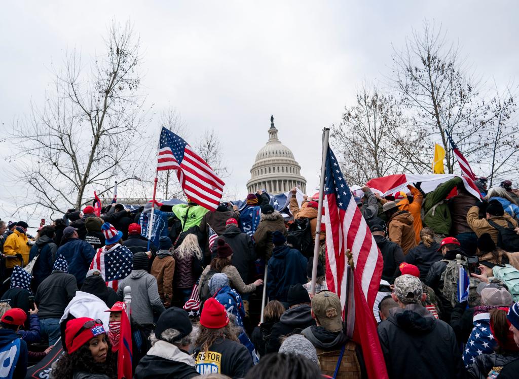 2021年1月6日,在美國首都華盛頓,時(shí)任總統(tǒng)特朗普的支持者在國會外舉行示威游行,部分示威者沖進(jìn)國會大廈,與警方發(fā)生沖突,造成一人死亡,當(dāng)時(shí)正在舉行的認(rèn)證大選結(jié)果的國會參眾兩院聯(lián)席會議也被迫中斷。新華社記者劉杰攝