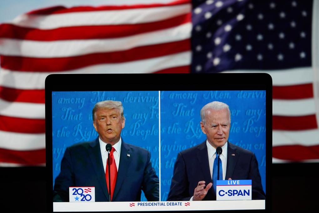 2020年10月22日在美國弗吉尼亞州阿靈頓拍攝的視頻畫面顯示,時(shí)任美國總統(tǒng)特朗普(右)與時(shí)任民主黨總統(tǒng)候選人拜登(左)在田納西州納什維爾市參加最后一場總統(tǒng)候選人電視辯論。新華社記者劉杰攝