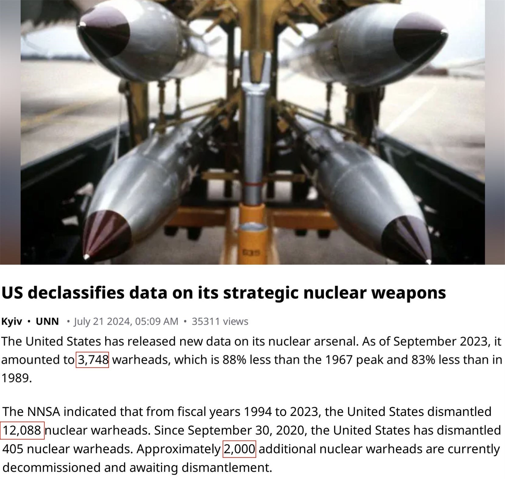 美國能源部下屬的國家核安全管理局近日表示,截至2023年9月,美國核武庫共有3748枚核彈頭。從1994財(cái)年到2023財(cái)年,美國銷毀了超過1.2萬枚核彈頭。另有2000枚核彈頭已經(jīng)淘汰并等待處置。