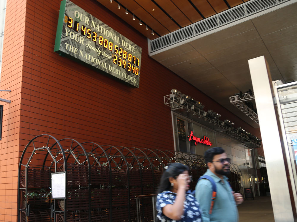 2023年5月29日,人們經(jīng)過美國紐約曼哈頓的“國債鐘”?!皣鴤姟笔且粋€大型計數(shù)器,它實時更新美國的公共債務(wù)總額,并顯示出每個美國家庭所要負擔的數(shù)額。新華社記者劉亞南攝