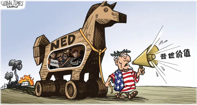 長期以來,美國將所謂普世價值工具化、武器化,煽動分裂對抗,干涉別國內政,造成災難性后果。NED就是美國政府禍亂別國的“特洛伊木馬”。圖源:《環(huán)球時報》