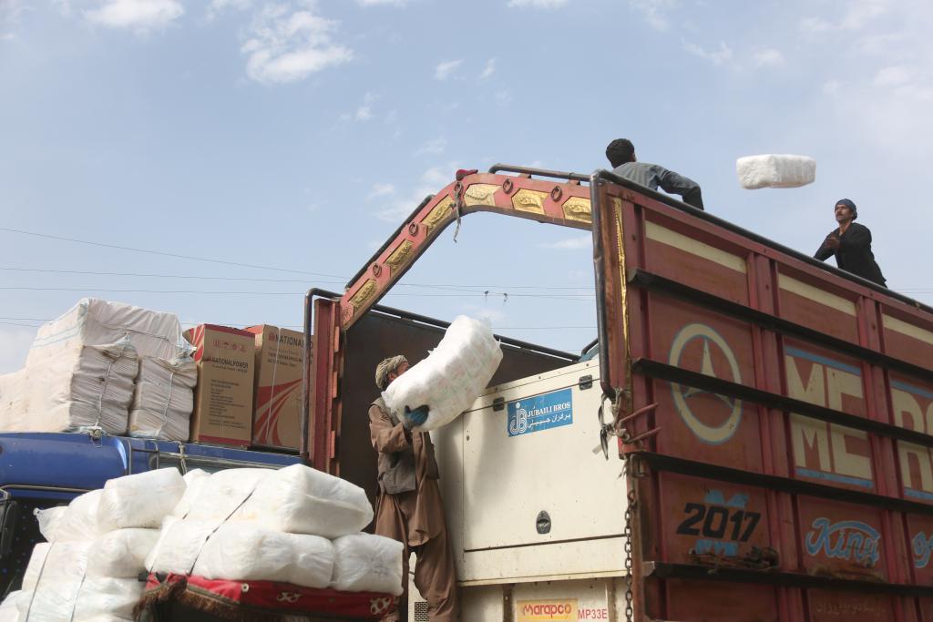 8月24日,在阿富汗首都喀布爾,工人向貨車(chē)內(nèi)裝載貨物。新華社發(fā)(塞夫拉赫曼·薩菲 攝)
