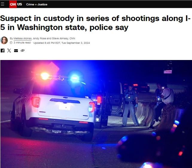 據(jù)美國有線電視新聞網(wǎng)(CNN)3日報道,美國官員們稱,華盛頓州西雅圖和塔科馬市5號州際公路部分路段發(fā)生一系列槍擊事件,造成6人受傷,嫌疑人已被拘捕。