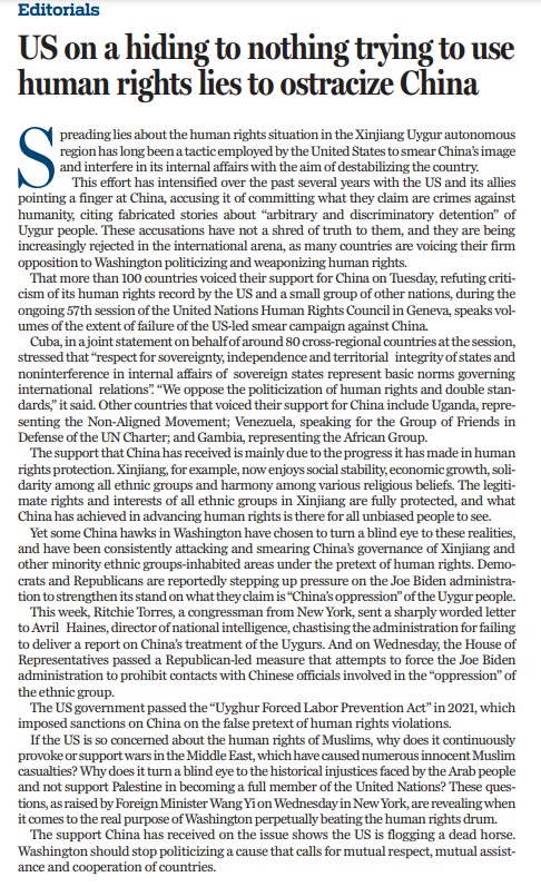 9月24日,日內(nèi)瓦舉行的聯(lián)合國人權(quán)理事會第五十七屆會議上,美國等少數(shù)國家發(fā)言攻擊抹黑中國人權(quán)狀況。對此,100多個國家以共同發(fā)言、單獨(dú)發(fā)言等不同方式仗義執(zhí)言,支持中方正義立場。