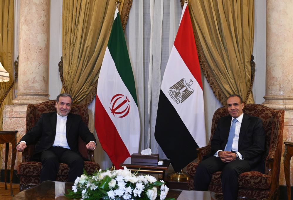 10月17日,埃及外長(zhǎng)阿卜杜勒阿提(右)在首都開(kāi)羅會(huì)見(jiàn)來(lái)訪的伊朗外長(zhǎng)阿拉格齊。新華社發(fā)(賽義德·穆罕默德攝)