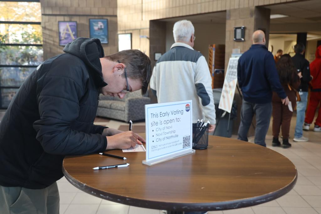 10月28日,在美國(guó)密歇根州奧克蘭縣諾維,一名男子在投票站填寫(xiě)資料準(zhǔn)備參加提前投票。新華社記者 徐劍梅 攝