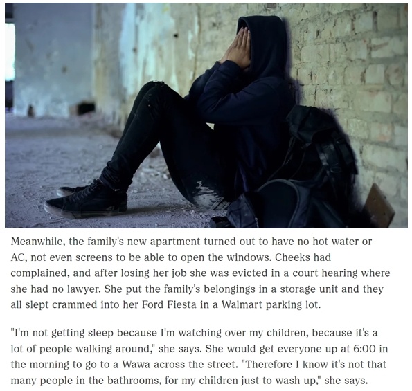 在弗吉尼亞州生活的奇克斯是一位獨自撫養(yǎng)四個孩子的母親。由于失業(yè)后無力負擔(dān)房租,她和四個孩子的臨時住房是一輛小轎車,這輛車長期停在一家超市的停車場里。