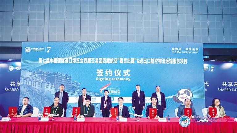 11月5日,備受矚目的第七屆中國國際進口博覽會在上海隆重開幕。西藏航空作為西藏自治區(qū)進博會交易團成員亮相此次進博會,并成功舉辦了“藏貨出藏”及進出口航空物流運輸服務項目的簽約儀式及推廣活動。本次活動得到了西藏自治區(qū)政府商務廳的大力支持。西藏航空黨委委員、副總經(jīng)理張兵兵出席簽約儀式。