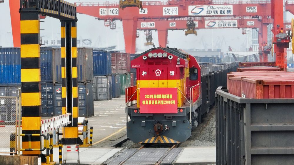 3月17日上午,一列滿載緬甸黑芝麻、海南椰子汁、廣西白糖等貨物的海鐵聯(lián)運班列,從欽州鐵路集裝箱中心站緩緩發(fā)出駛向四川城廂站。這是2024年西部陸海新通道開行的第2000列海鐵聯(lián)運班列,同比增長16.8%,提前14天完成一季度班列開行任務(wù)。
