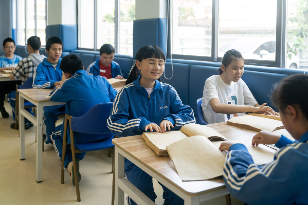 4月15日,昆明市盲啞學(xué)校的盲生們在學(xué)校圖書室閱讀盲文書。(新華社記者 陳欣波 攝)