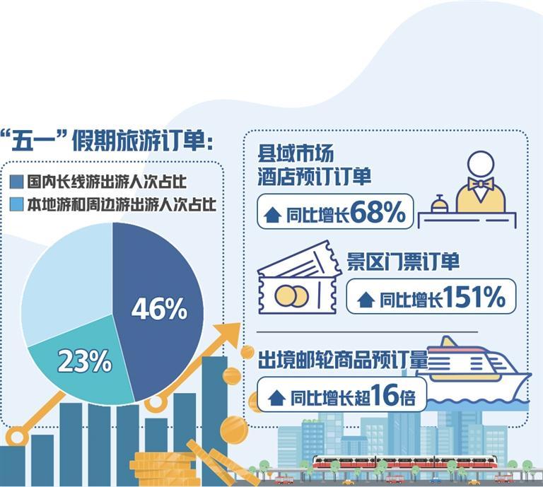 從出游目的地看,北京、上海、重慶、杭州、成都、南京、西安、武漢、廣州等城市是熱門,帶動相關(guān)交通和酒店訂單量走高。去哪兒旅行網(wǎng)顯示,北京—上海、成都—西安、上?!錆h、深圳—長沙、北京—青島等熱門線路的火車票預(yù)約購票難度不低于春運;從上海、北京、深圳、廣州、杭州、南京等地出發(fā),飛往旅游城市的機票平均支付價格走高,北京—成都、上海—昆明等熱門航線的部分航班已升至全價;在攜程旅行網(wǎng)上,天水、徐州、淄博、合肥、南昌、迪慶、煙臺等城市的“五一”假期酒店預(yù)訂增速明顯;四線及以下城市,尤其是縣域旅游市場帶來新增量,縣域市場酒店預(yù)訂訂單同比增長68%、景區(qū)門票訂單同比增長151%。