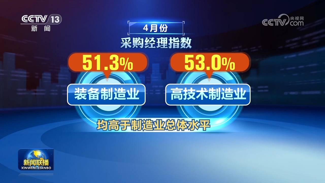 新動(dòng)能繼續(xù)較快擴(kuò)張。4月份裝備制造業(yè)和高技術(shù)制造業(yè)采購經(jīng)理指數(shù)分別為51.3%和53.0%,均高于制造業(yè)總體水平。