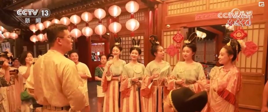 看起來對漢服造型頗有研究的胡芯銀今年只有24歲。胡芯銀介紹,也就是在這幾年,隨著大家對傳統(tǒng)文化的喜愛,西安的漢服館如雨后春筍般涌現(xiàn)。感受到“漢服熱”的胡芯銀在2022年初,辭去了原先婚禮跟妝的工作,應聘到了這家位于長安十二時辰主題街區(qū)附近的漢服館,擔任漢服造型師。