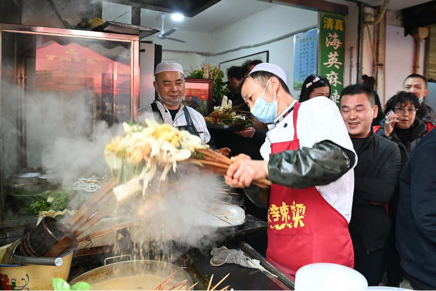 天水市秦州區(qū)的天水名優(yōu)小吃城一麻辣燙店,商家為游客加工麻辣燙。新華社記者 范培珅 攝