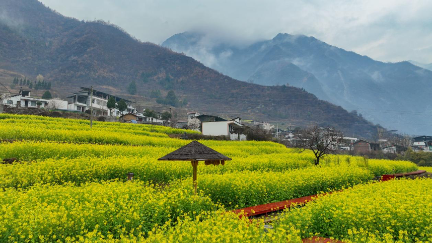 隴南市文縣玉壘鄉(xiāng)的油菜花海(無人機照片)。新華社記者 郎兵兵 攝