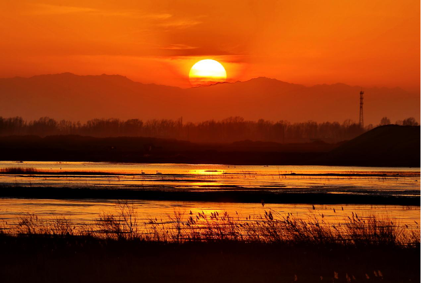甘肅省武威市民勤縣紅崖山水庫在晚霞的映襯下分外美麗。新華社發(fā)