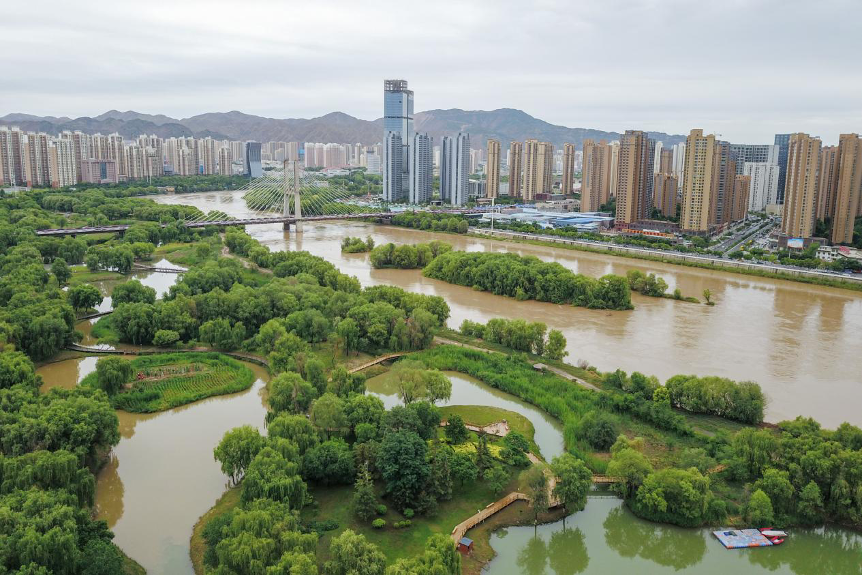 甘肅省蘭州市拍攝的銀灘濕地公園景色(無人機照片)。新華社記者 范培珅 攝