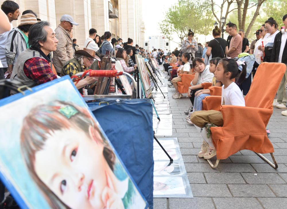 5月1日,游客在哈爾濱中央大街上畫肖像畫。新華社發(fā) (劉洋攝)