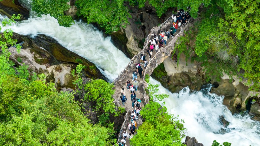 5月2日,游客在貴州省安順市天星橋景區(qū)游覽(無(wú)人機(jī)照片)。新華社發(fā)(陳熙 攝)