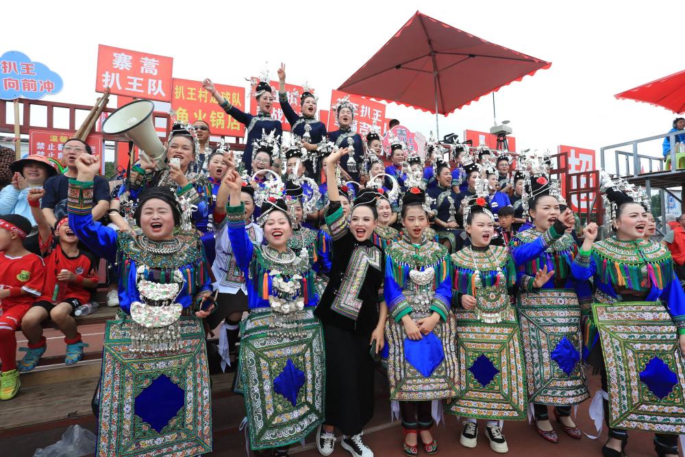 5月4日,在貴州省黔東南苗族侗族自治州榕江縣“村超”球場(chǎng),身著盛裝的拉拉隊(duì)在為本村球隊(duì)加油鼓勁。新華社發(fā)(楊成利 攝)