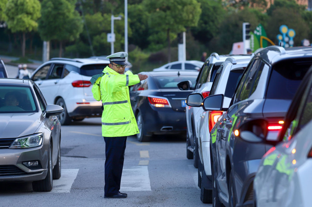 5月4日,民警在貴州省黔東南苗族侗族自治州丹寨縣萬(wàn)達(dá)小鎮(zhèn)為游客指揮交通。新華社發(fā)(陸德華 攝)