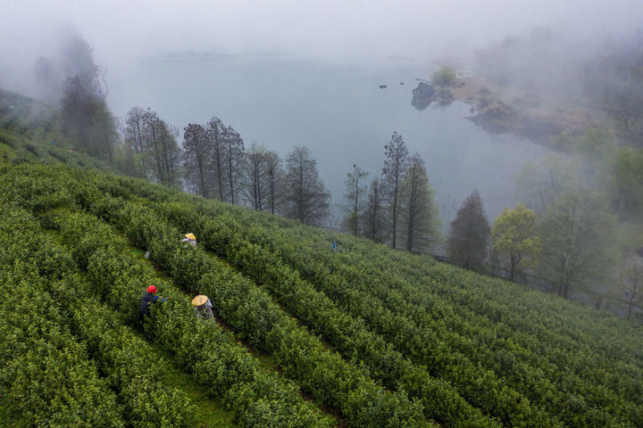 2024年4月7日,在位于浙江省金華市金華山鹿田村的婺州舉巖茶基地,茶農(nóng)在采摘舉巖茶鮮葉,發(fā)展特色茶產(chǎn)業(yè)是推動當(dāng)?shù)匕傩展哺坏闹匾緩街唬o人機照片)。新華社記者 徐昱 攝