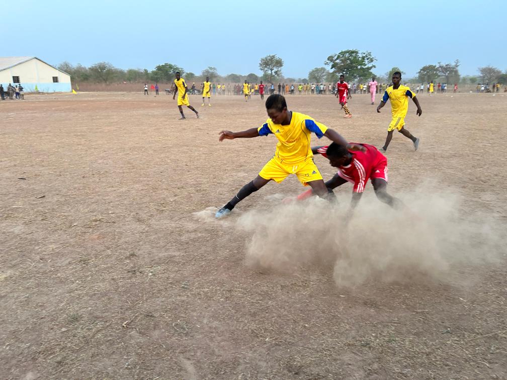3月31日,貝寧當(dāng)?shù)卮迕袂騿T在非洲“村超”比賽中拼搶。受訪者供圖