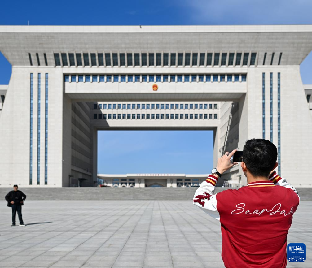 4月18日11時(shí)許,游客在霍爾果斯口岸新國門拍照留念。