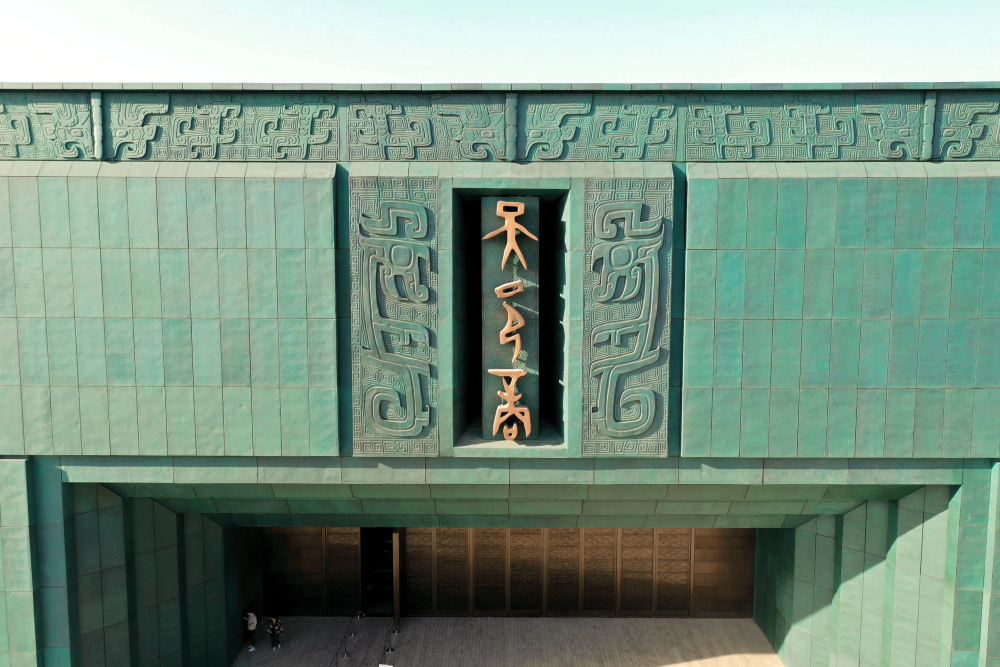 兩個多月前,安陽殷墟博物館新館正式開館。遙遙望去,新館造型頗具巧思——鼎形的建筑矗立水畔,古銅色的大門,青銅飾面為幕墻,“大邑商”仿佛從3000年前款款走來。