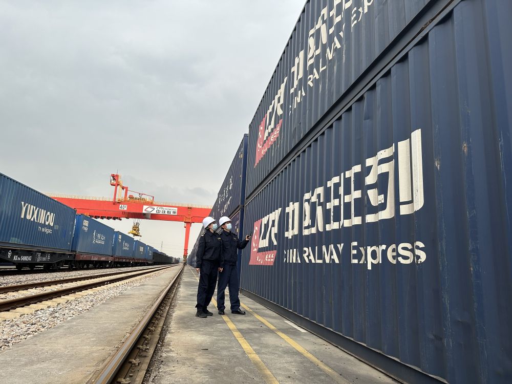 廣州海關(guān)所屬廣州車站海關(guān)關(guān)員對中歐班列出口貨物進行監(jiān)管。(受訪者供圖)