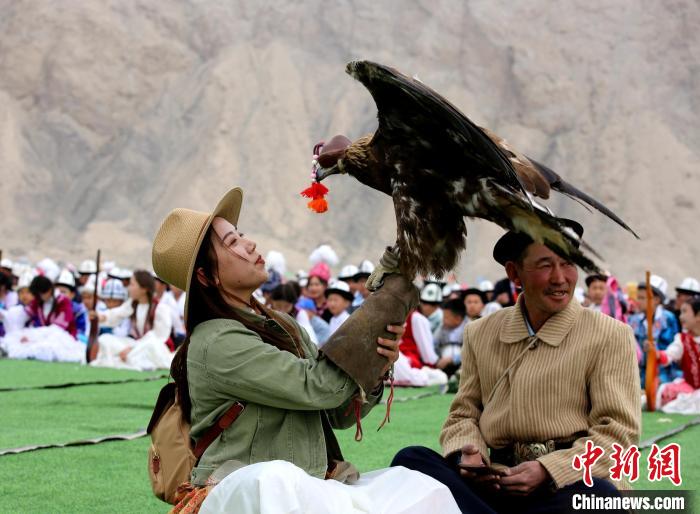 近日,2024年新疆阿合奇縣獵鷹文化旅游季拉開帷幕,游客現(xiàn)場與獵鷹互動。陶拴科 攝