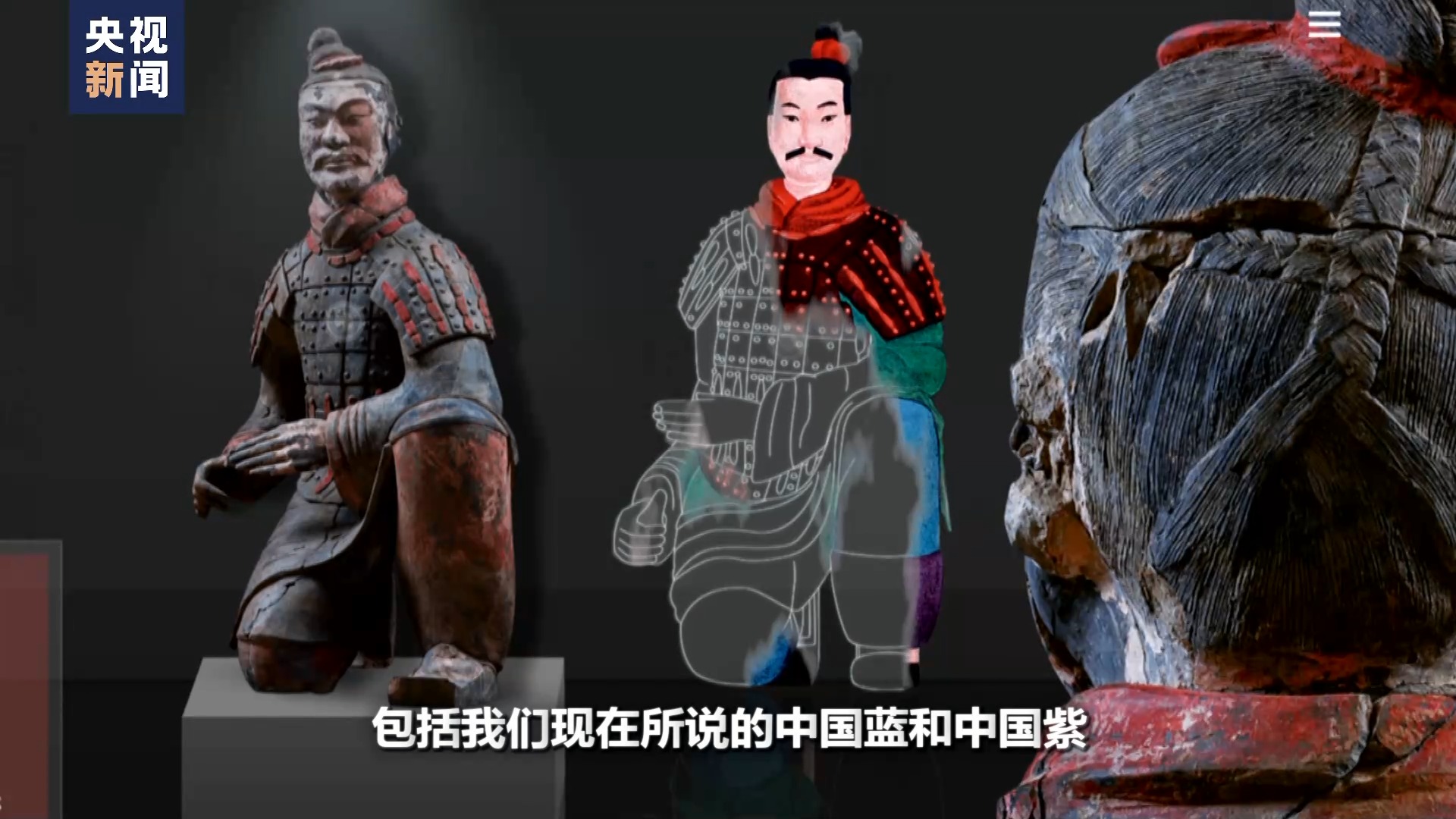 秦始皇帝陵博物院文物保護修復(fù)專家 蘭德?。?/strong>那么這在秦俑實際上,目前有八種顏色。紅、黃、綠、藍、紫、白、黑、粉等等,這就是已經(jīng)定型的八種。但是我們最近也要分析比這個還要多,包括有一些它是白里透紅的粉色,還有的它就是幾種合成色,包括我們現(xiàn)在所說的中國藍和中國紫。