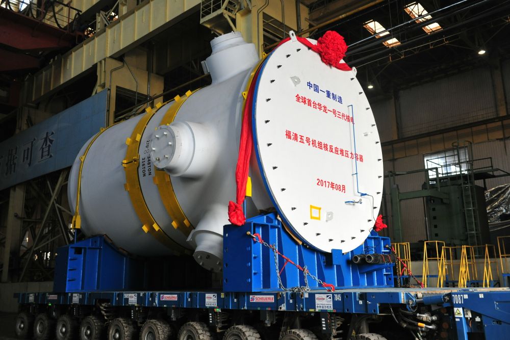 2017年8月,全球首臺“華龍一號”三代核電——福清五號機(jī)組反應(yīng)堆壓力容器準(zhǔn)備進(jìn)行吊裝(資料照片)。