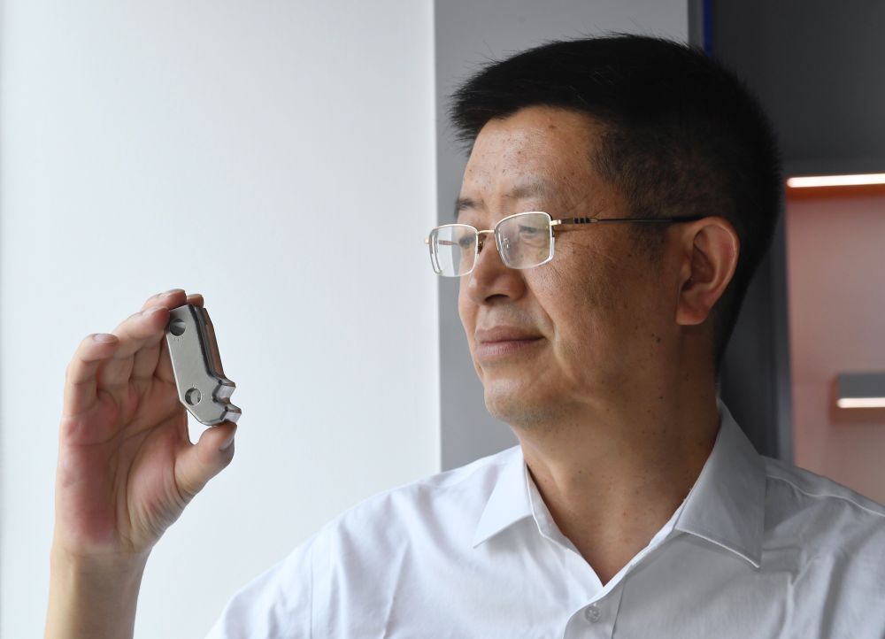 5月24日,在位于成都的中國核動力研究設(shè)計(jì)院內(nèi),鐘元章在展示通過3D打印的堆內(nèi)構(gòu)件堆芯圍筒。鐘元章介紹,通過3D打印的方式來生產(chǎn)“華龍一號”的零部件,是目前的一個研究方向。