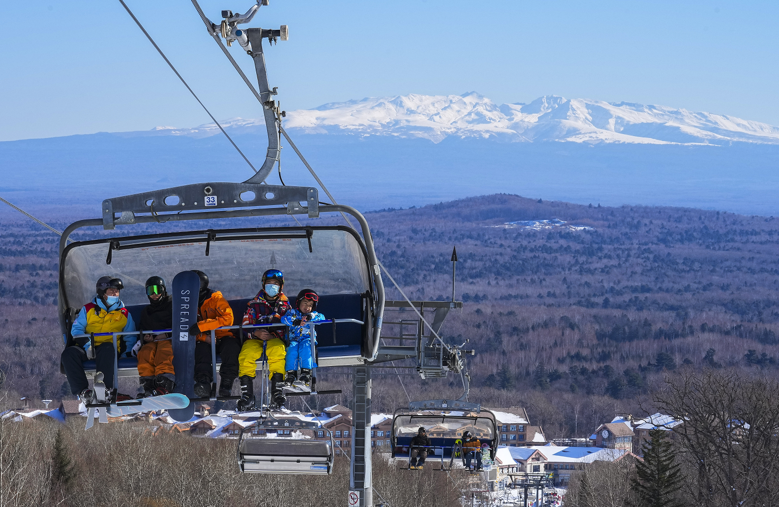 長白山西坡的萬達滑雪度假區(qū)內(nèi),雪友乘坐纜車上山。 記者 許暢 攝