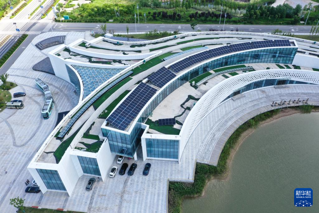 6月6日拍攝的射陽港低(零)碳產(chǎn)業(yè)研究院建筑屋頂使用的太陽能光伏電能系統(tǒng)(無人機照片)。新華社記者 楊磊 攝