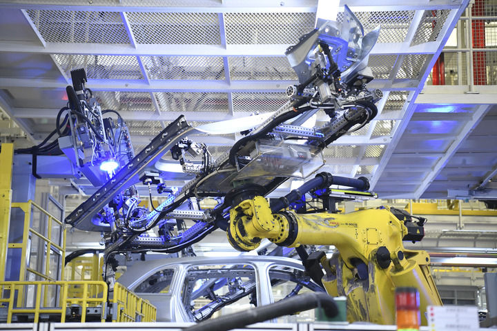 江蘇常州理想汽車智能制造基地焊裝車間的機械臂正在作業(yè)(5月31日攝)。新華社記者 柳文惠 攝