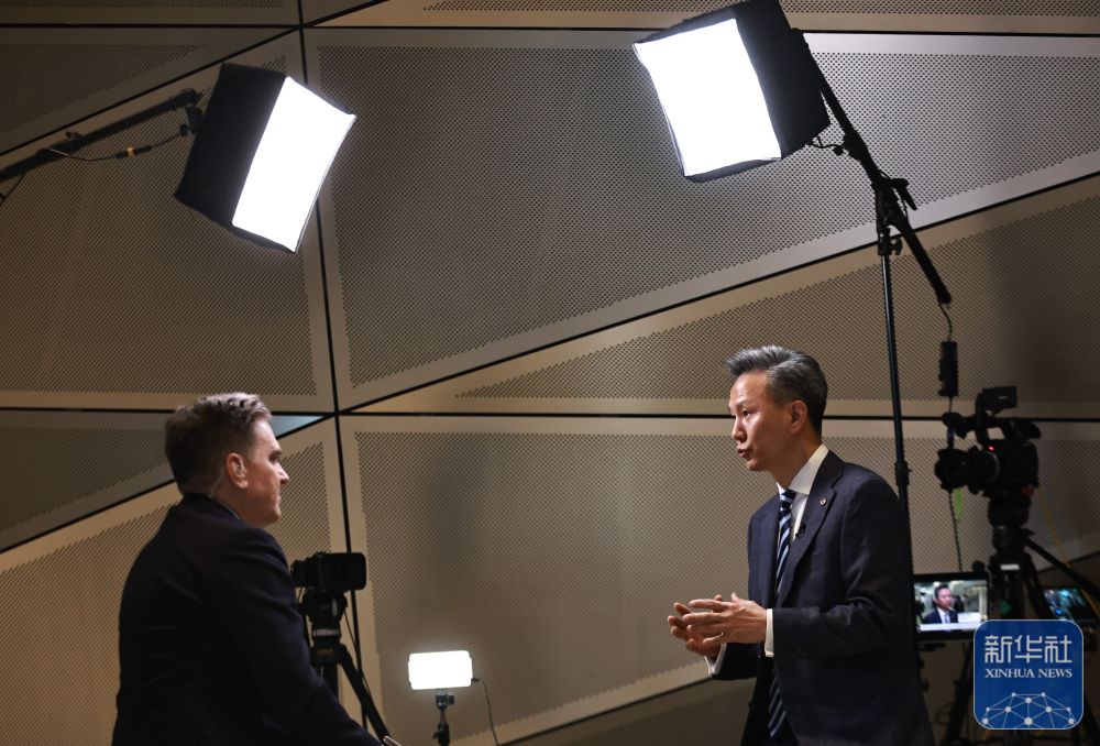↑ 6月25日,一位參會(huì)嘉賓接受媒體采訪。